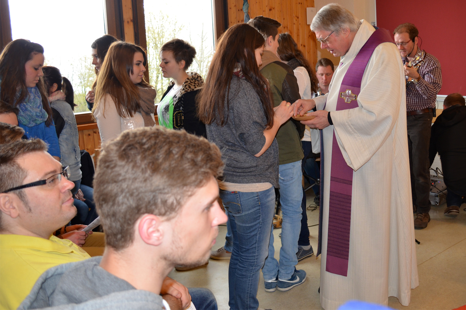In Fahrgemeinschaften ging es bei strahlendem Sonnenschein, guter Laune und großen Erwartungen in die schöne, aber kühle Rhön. Eine Tasse Kaffee und ein Hörnchen, dann stand der Gottesdienst für die etwa 40 jungen Frauen und Männer auf dem Programm. Ganz unter dem Thema „Energie“ feierten die Azubis des Bistums mit Generalvikar Dr. Karl Hillenbrand die Messe.