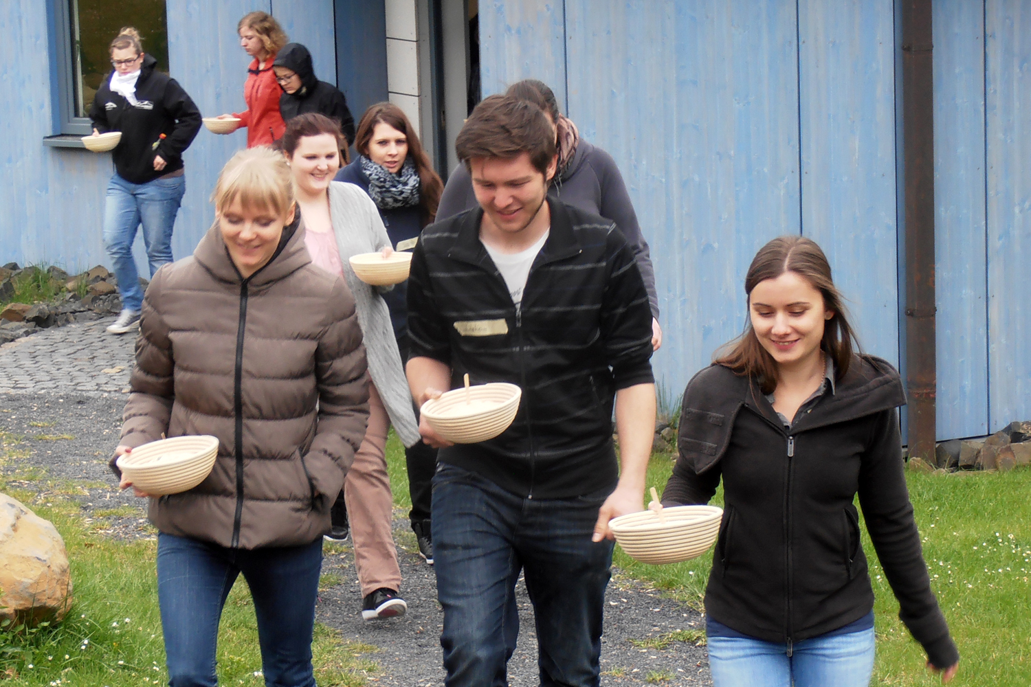 Hillenbrand betonte, wie wichtig die Ausbildung in der Diözese Würzburg sei und dass diese an Stellenwert in den vergangen Jahren sogar stark zugenommen habe. Nach der Gesprächsrunde arbeiteten die jungen Frauen und Männer in fünf Workshops, geleitet von Sebastian Volk und seinem Team. Sie sind Mitarbeiter der Kirchlichen Jugendarbeit der Diözese Würzburg. Themen waren „Energie aus der Ruhe – Zen Garten“ und „Energie in der Gruppe – Team in Nature“. Sehr gut angenommen wurden vor allem die Workshops „Energie für den Leib – Brotbacken im Holzofen“ und „Energie für den Körper – Yoga, Entspannung, Übungen“.