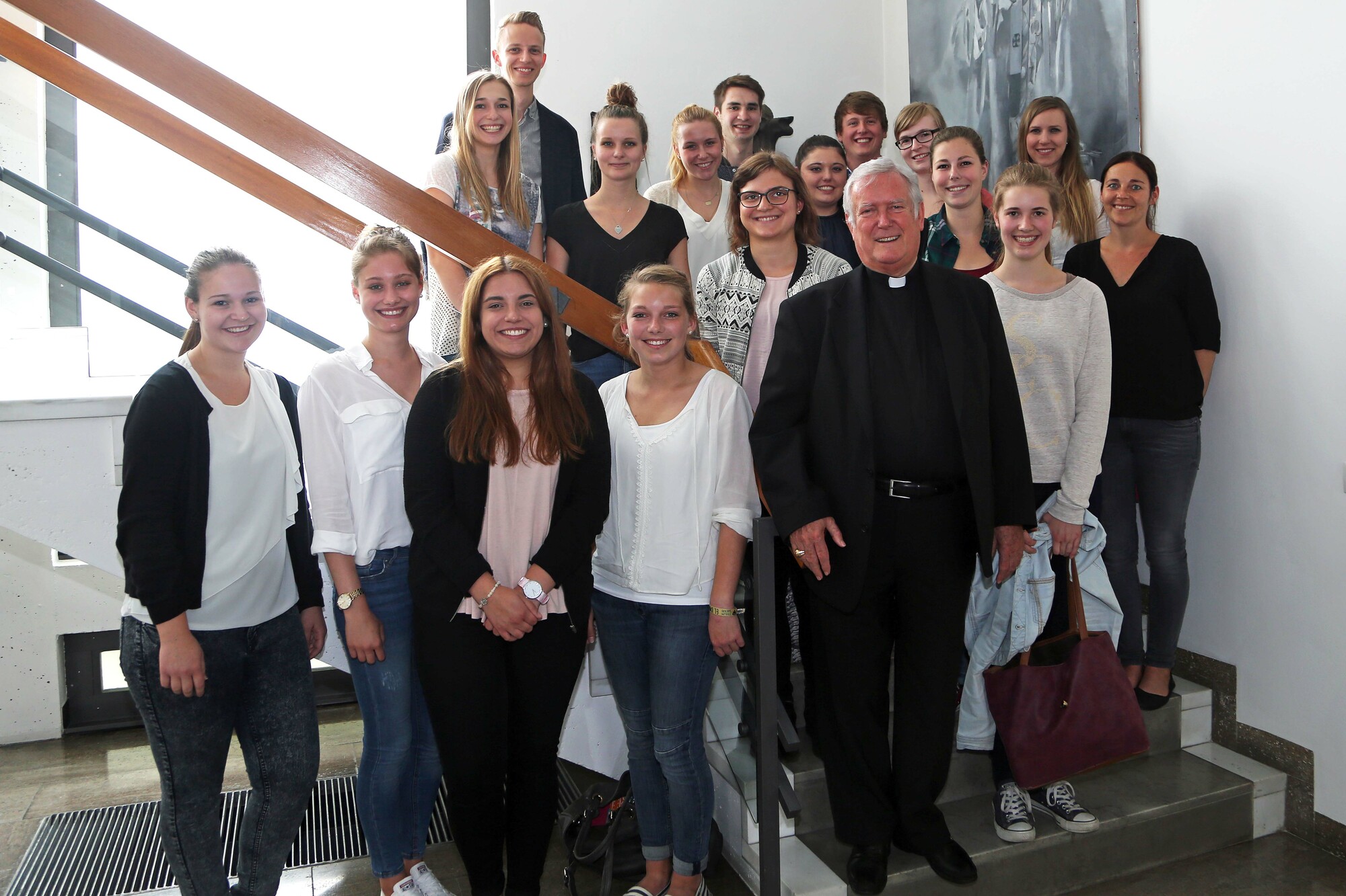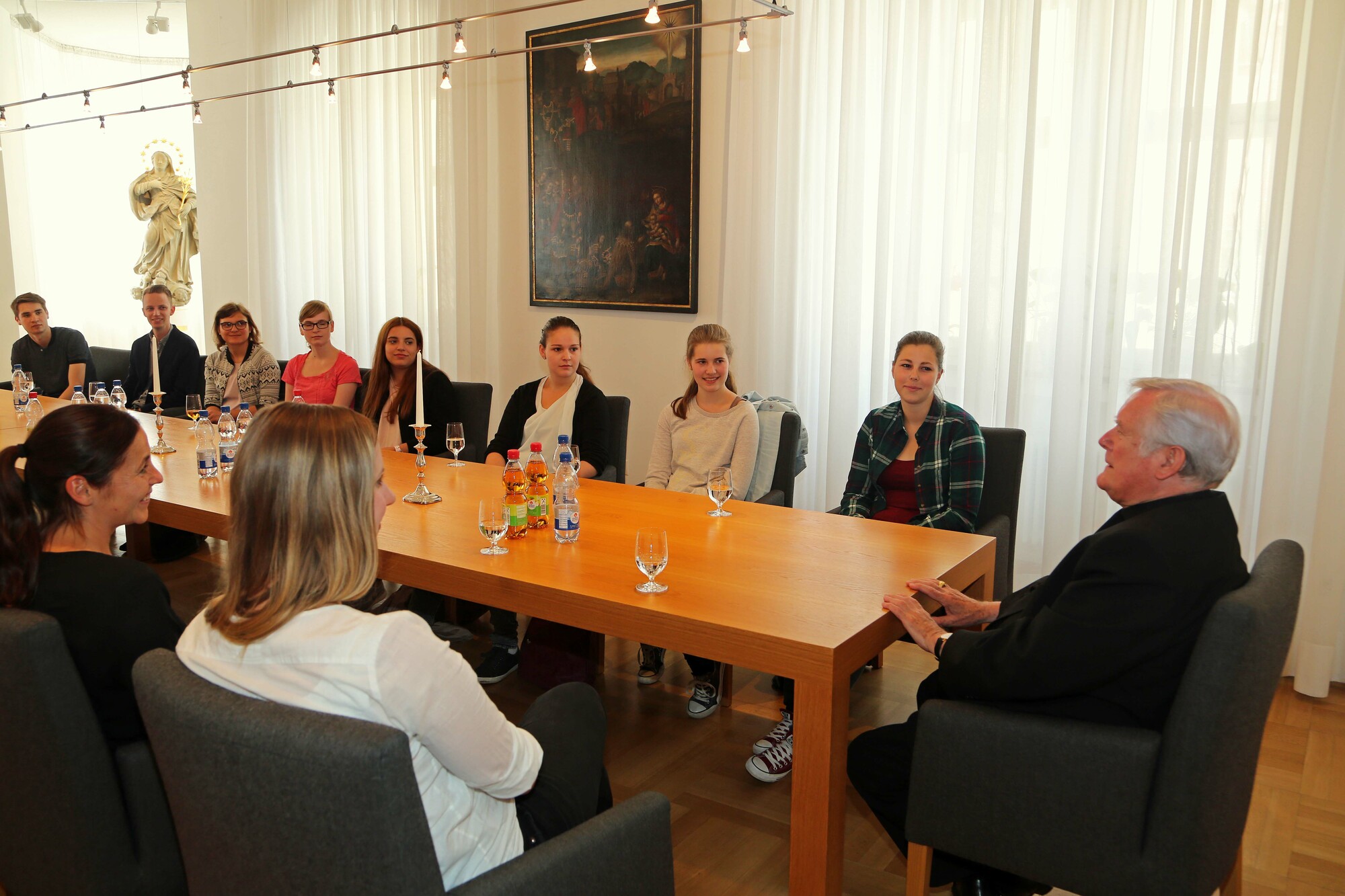 Insgesamt 15 junge Menschen begannen am 1. September 2015 beziehungsweise am 1. September 2014 ihre Ausbildung als Bürokauffrau/-mann für Büromanagement. Für das Treffen hatten sie viele Fragen vorbereitet, die Bischof Hofmann bereitwillig beantwortete. So erzählte er, dass er nach dem Abitur vor der Entscheidung gestanden habe, auf die Kunstakademie zu gehen – und sich doch für das Theologiestudium entschieden habe. „Ich habe es nicht bereut, ich würde heute wieder den gleichen Weg gehen.“ Was er an seiner Arbeit am meisten möge, wollte eine junge Frau wissen. „Den Kontakt mit den Leuten und die Begegnung, vor allem mit Kindern und Jugendlichen“, antwortete Bischof Hofmann. Es sei ein unvergessliches Erlebnis, wenn die Kindergarten- und die Kommunionkinder bei der Kiliani-Wallfahrtswoche in den Dom einziehen. Als Bischof reise er auch sehr viel durch die Welt. Er erzählte von einer Blechhütte mitten in einem afrikanischen Slum, in der er einen begeisternden Gottesdienst erlebt habe. Auch die Meinung des Bischofs zum Zölibat interessierte die jungen Menschen. Das sei ein „sehr umstrittenes Thema“, sagte Bischof Hofmann. Er sehe darin ein Glaubenszeugnis, das, wenn es verstanden wird, sehr große Wirkung habe. „Es ist eine Entscheidung für dieses Abenteuer mit Gott.“ Zum Abschluss des Gesprächs sagte er zu den jungen Menschen: „Wir müssen Nähe zu den Menschen haben, und das wird auch Ihre Aufgabe sein.“ Jeder Auszubildende bekam einen Kirchenführer „Der Kiliansdom zu Würzburg“. Begleitet wurden sie von Stefanie Kremling und Katrin Hammer von den Personalabteilungen des Bischöflichen Ordinariats beziehungsweise des Diözesancaritasverbands.