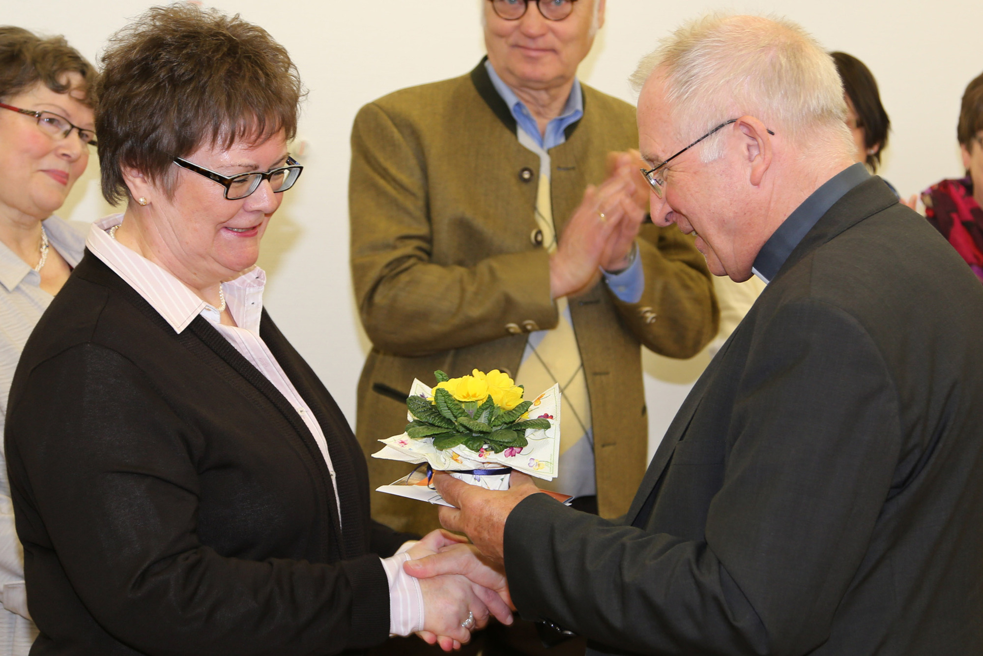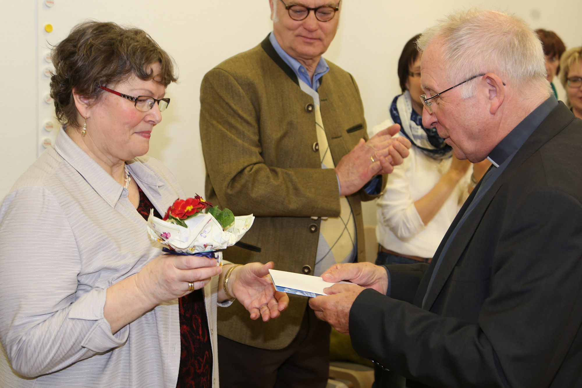 Sie sprach ein Gebet der heiligen Theresa von Avila, „einer Frau, die zu ihrer Zeit für Frauen ungewöhnliche Plätze gesucht und ausgefüllt hat“. Wie die beiden Verabschiedeten habe die Heilige in einzigartiger Weise Beruf und Berufung bestens miteinander verbunden. Im Namen ihrer Kolleginnen und Kollegen aus den Diözesanbüros dankte Margit Rotter vom Diözesanbüro Würzburg Kruse für die herausragende Zusammenarbeit. „Sie sind eine Frau mit großem Herzen.“
