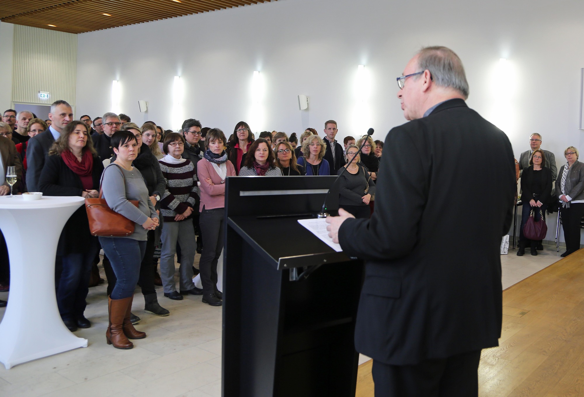 „Wir alle miteinander dürfen dazu beitragen, dass das Leitwort ,Diözese Würzburg – Kirche für die Menschen‘ mit Leben gefüllt ist“, sagte er vor rund 250 Mitarbeitern. Der Generalvikar sprach einige Projekte an, die im vergangenen Jahr angestoßen wurden, unter anderem die „Pastoral der Zukunft“. „Überlegungen brauchen Zeit und Diskussion, aber auch eine Vorstellung, wie eine zukünftige Gestaltung aussehen kann“, sagte er. „Solche Wege sind manches Mal mühsam, aber wir müssen sie gehen. Und dabei sind wir nicht allein.“ Als wichtigen Schritt bezeichnete der Generalvikar die neue Geschäftsordnung. Sie sei mehr als ein Rahmen für das Handeln der Verwaltung, sondern wolle dazu verhelfen, „unser aller Handeln transparent und nachvollziehbar“ zu machen. Zudem könne sie eine gute Brücke sein, um einem neuen Bischof dabei zu helfen, im Bistum anzukommen und sich zu positionieren. Weiter kündigte er für das erste Quartal des neuen Jahres eine monatliche Gesprächsrunde an. „Die Kommunikation und Mitarbeiterinformation bleibt ein großes Anliegen“, betonte er. „Es ist wichtig und richtig, sich selbst und die Arbeit zu reflektieren, den Alltag zu hinterfragen und sich mit anderen Zielen neu auszurichten“, sagte Dorothea Weitz, Vorsitzende der Mitarbeitervertretung (MAV) des Bischöflichen Ordinariats. „Mein Wunsch für das neue Jahr 2017 ist, dass wir bei all unserem Tun achtsam, respektvoll und barmherzig miteinander umgehen.“ Musikalisch begleitete Ruth Weisel, Referentin im Liturgiereferat der Diözese Würzburg, die Begegnung am Klavier.