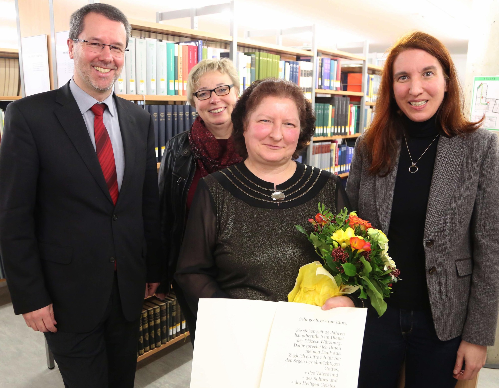 „Ihre Initiative und Ihr wacher Blick tun unserem Haus gut“, sagte Professor Dr. Johannes Merz, Leiter von Archiv und Bibliothek der Diözese Würzburg, bei einer Feierstunde. Im Namen der Mitarbeitervertretung (MAV) des bischöflichen Ordinariats Würzburg überbrachte Vorsitzende Dorothea Weitz Glück- und Segenswünsche und trug ein Gedicht von Dorothee Sölle vor. Ihren Dienst bei der Diözese Würzburg trat die Würzburgerin Ehm 1991 im Diözesanarchiv an. Dort war sie im Sekretariat und im Bereich der Benutzerbetreuung und Familienforschung tätig. Zudem engagierte sie sich beim Aufbau der Klerikerdatenbank, einem Fundstellennachweis zu Klerikern des Bistums Würzburg vom Mittelalter bis in die Gegenwart. Nach dem Umzug in den Neubau von Archiv und Bibliothek in der Domerschulstraße war Ehm hauptsächlich in der Benutzerbetreuung im Einsatz, bevor sie 2007 schließlich in die Diözesanbibliothek wechselte. Nach einer umfangreichen Fortbildung erfüllt sie mittlerweile eine Bandbreite an bibliothekarischen Verwaltungsaufgaben und gehört zum festen Kern des Bibliotheksteams.