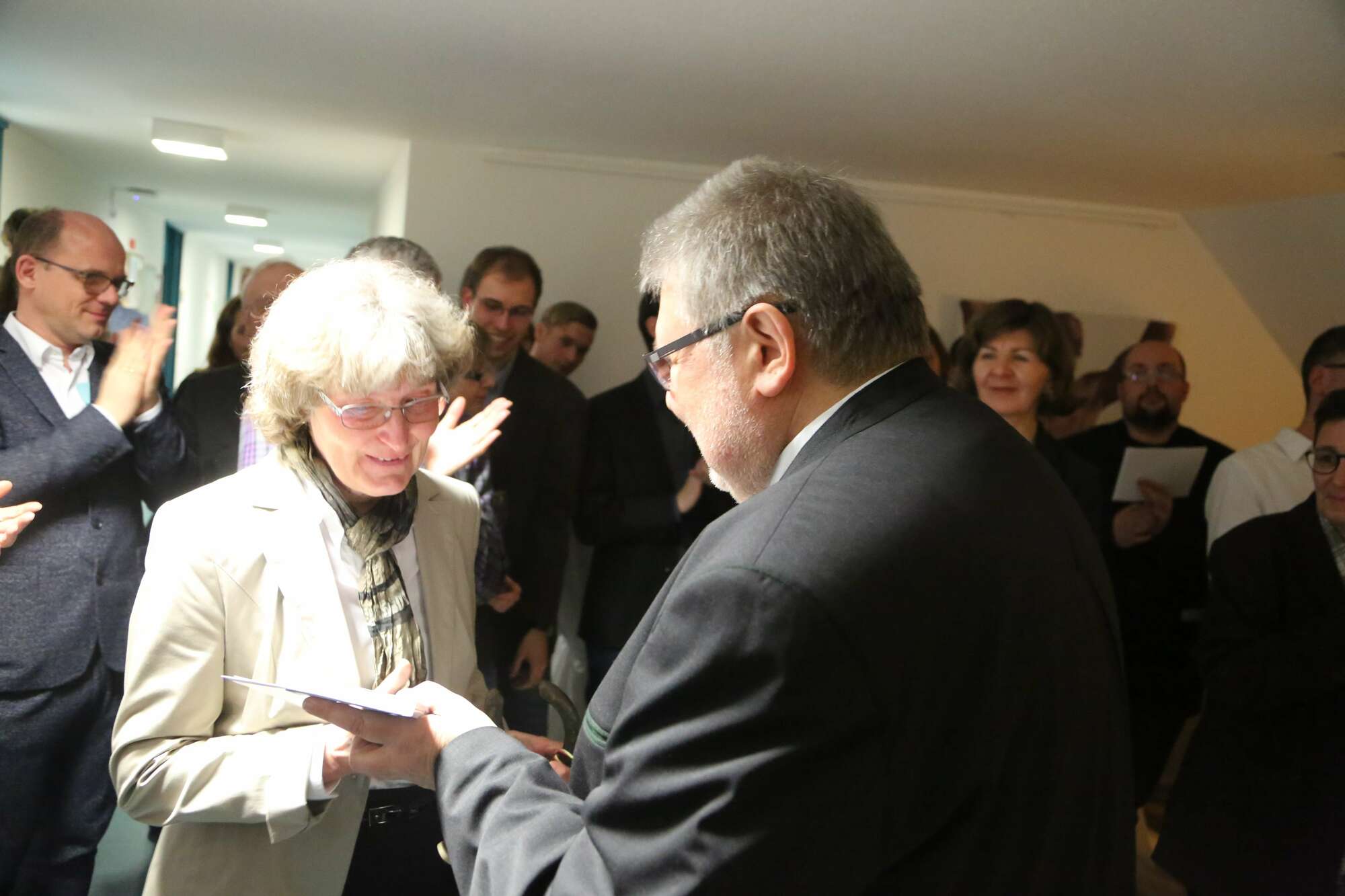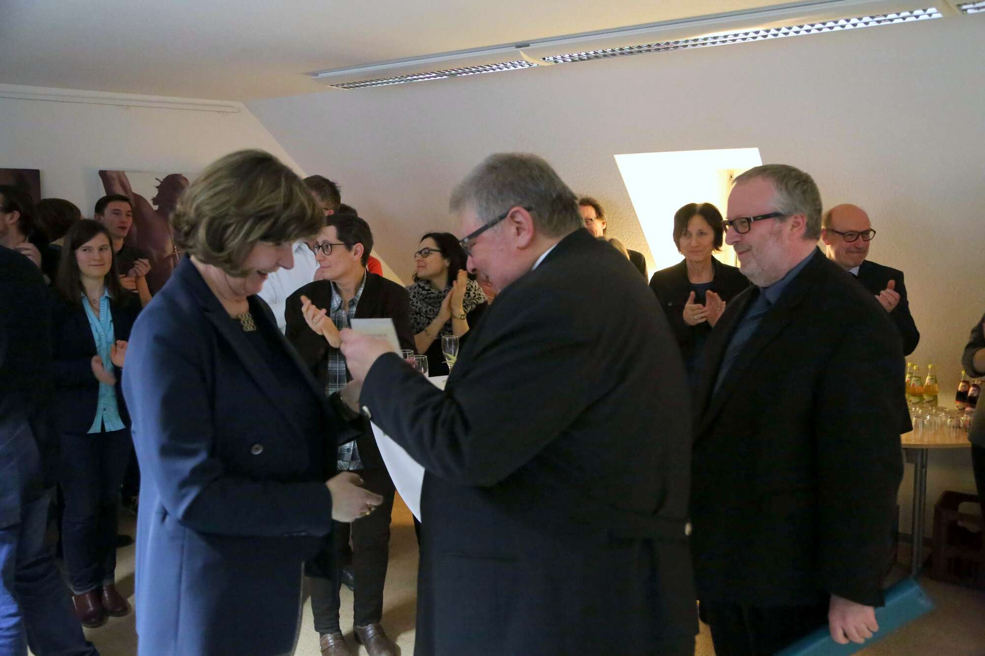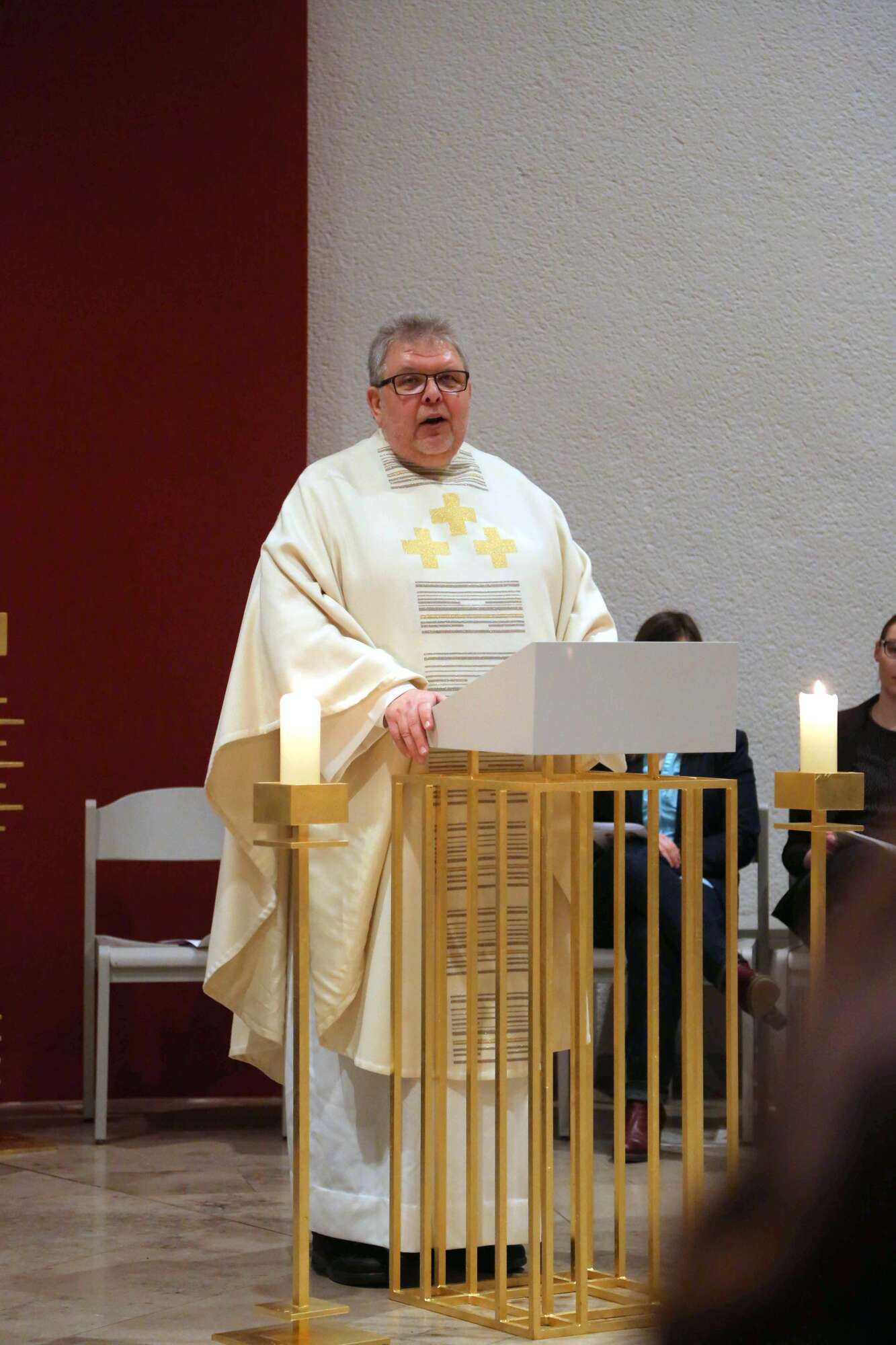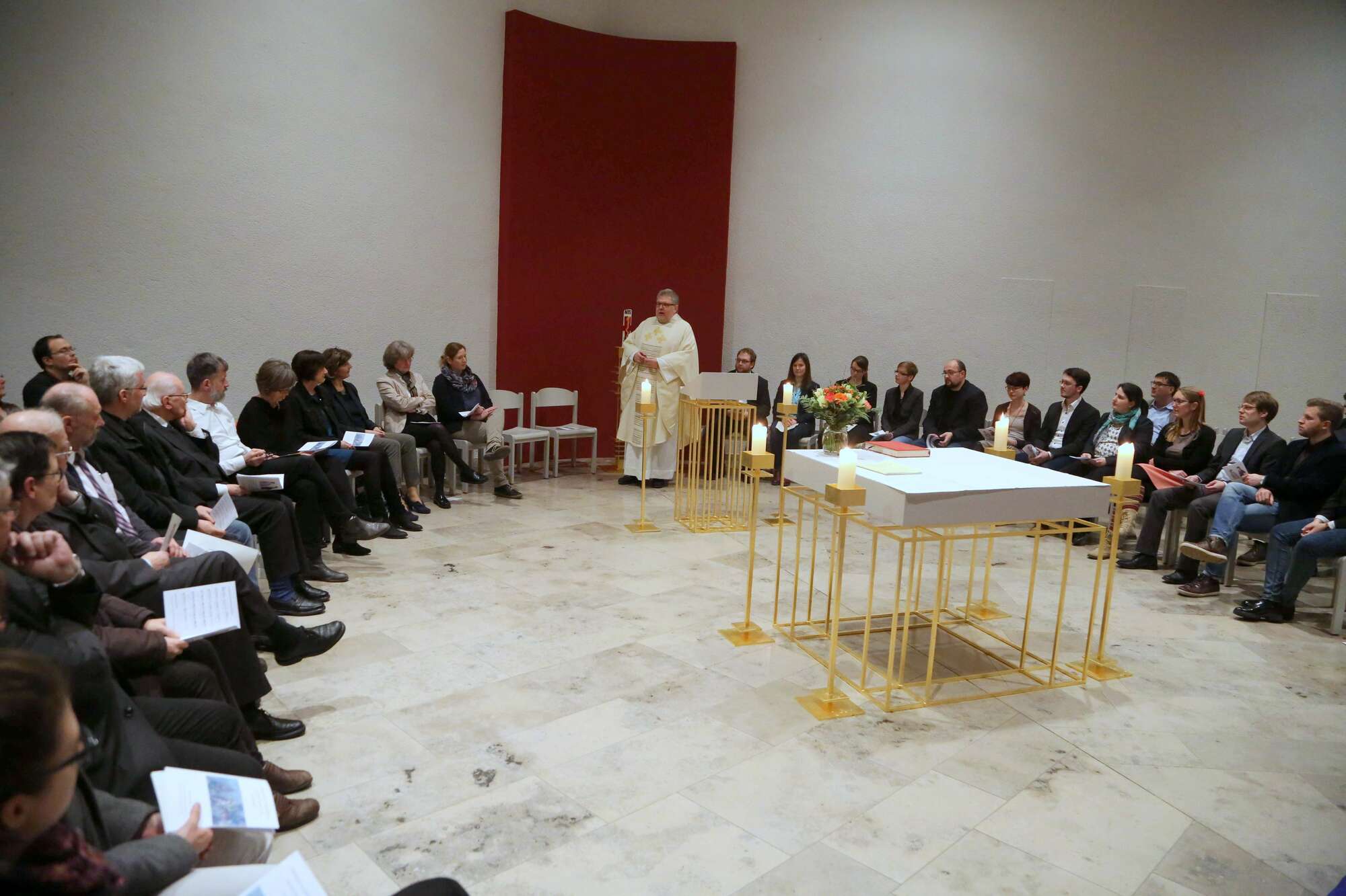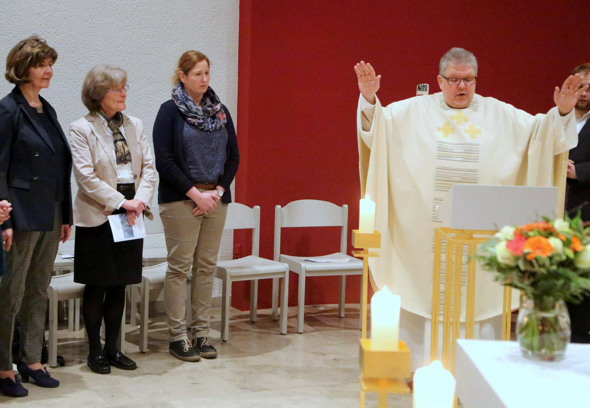 Schneider ist künftig bei den Erlöserschwestern tätig, Baumann geht in den Ruhestand. Personalreferent Domkapitular Monsignore Dietrich Seidel sagte beiden im Namen der Bistumsleitung Dank für ihren Einsatz. „Du warst immer eine Mentorin mit Leib und Seele, eine Kämpferin für ihre Anliegen und das Thema Spiritualität“, sagte Seidel zu Schneider. Baumann würdigte er als „gute Seele hier im Zentrum“. Dank, Segenswünsche und Geschenke überbrachten neben den Studierenden unter anderem auch Dr. Jürgen Emmert im Namen der Mitarbeitervertretung (MAV), Ausbildungsleiterin Andrea Schoknecht und Stimmbildnerin Annette Schuhmann, Gudrun Heid, Sprecherin der Pastoralreferenten, Johannes Reuter, Diözesanreferent der Pastoralreferenten, sowie Hermann Nickel vom Mentorat künftiger Religionslehrer. Baumann trat 1970 in den Dienst der Diözese. 1992 begann sie als Angestellte im Bürodienst im damals noch „Pasti-Zentrum“ genannten Zentrum für Pastoralassistentinnen und ‑assistenten. Pastoralreferentin Schneider übernahm die Aufgabe der Mentorin im Juni 1999. In seiner Predigt im Gottesdienst berichtete Domkapitular Seidel von einem Kruzifixus, den ein Bauer einst so schnitzen ließ, dass genau dort, wo das Herz ist, eine Aussparung für das Auslaufrohr des Hofbrunnens blieb. „So lief dort bei Tag und Nacht das Wasser heraus und machte deutlich: Christus ist der Quell allen Lebens.“ An Baumann und Schneider gewandt sagte er: „Euer Dienst ermutigt die Menschen, sich auf Jesus als Quelle des Lebens einzulassen.“ Insbesondere Schneider habe die ihr Anvertrauten ermutigt, sich für Jesus zu öffnen und so jedem Einzelnen den Quellgrund erschlossen.