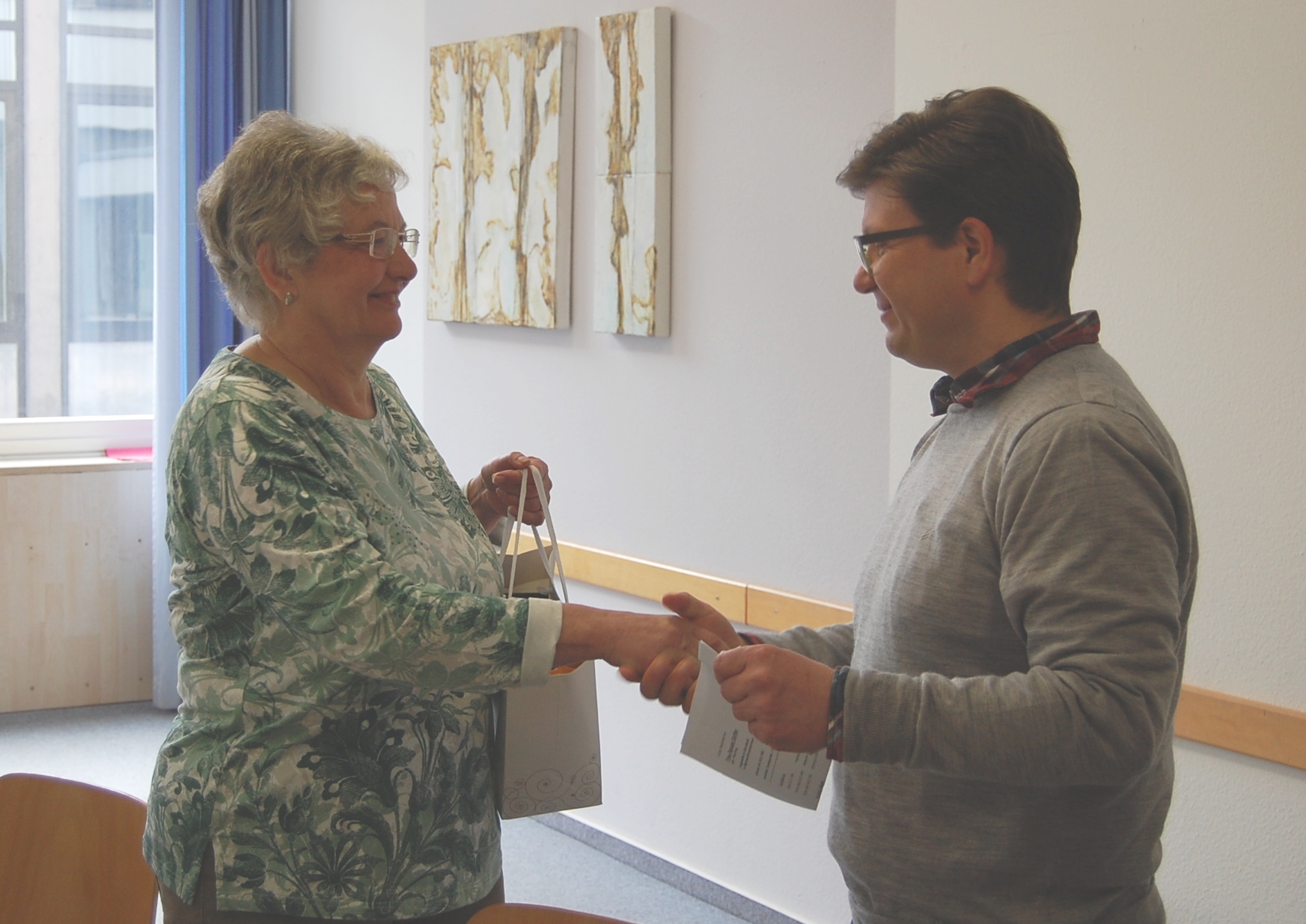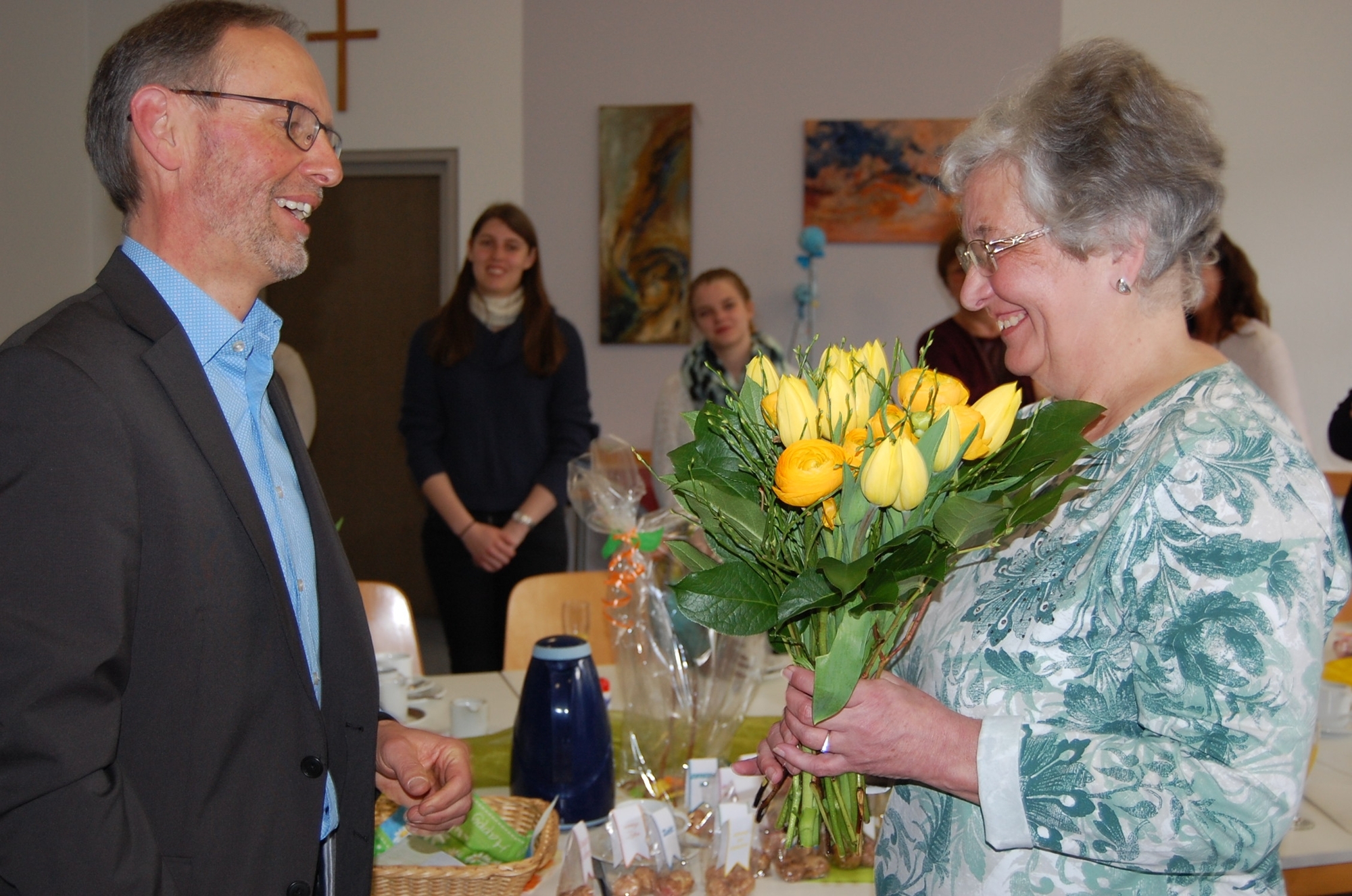 Nun wurde sie im Rahmen eines Hausgottesdienstes mit anschließendem Frühstück verabschiedet. Die Hausleitung, der Vorstand, die MitarbeiterInnen und Dieter Engelhardt von der Mitarbeitervertretung brachten Frau Dörfler ihren Dank auf vielfältige Weise zum Ausdruck.