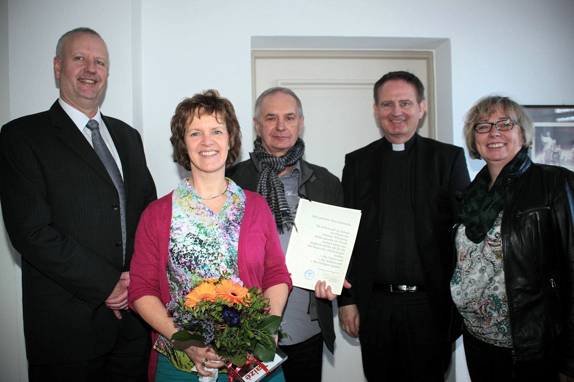 Würzburg/Schweinfurt/Dettelbach (POW) Für jeweils 25 Jahre im Kirchendienst hat Domdekan Prälat Günter Putz, Schulreferent des Bistums Würzburg, am Montag, 17. Februar, die Religionslehrer i. K. Harald Kalamala (62) und Stefanie Just (52) geehrt. Bei einer Feierstunde im Bischöflichen Ordinariat dankte er den beiden für ihren Einsatz. „Sie sind Ansprechpartner in ihren Schulen und machen durch ihr Wirken Christi Botschaft für ihre Schüler sichtbar“, betonte Putz. Personalleiter Ordinariatsrat Thomas Lorey erklärte, es werde immer seltener, dass Mitarbeiter einem Arbeitgeber so lange wie die beiden Geehrten die Treue hielten. Er bedauere das sehr. Im Namen der Mitarbeitervertretung (MAV) überbrachte die Vorsitzende Dorothea Weitz Glück- und Segenswünsche. Neben einem ignatianischen Tagesrückblick überreichte sie Kalamala und Just, die sich beide musikalisch stark engagieren, jeweils eine CD mit Liedern aus dem ökumenischen Wallfahrtsort Taizé.
