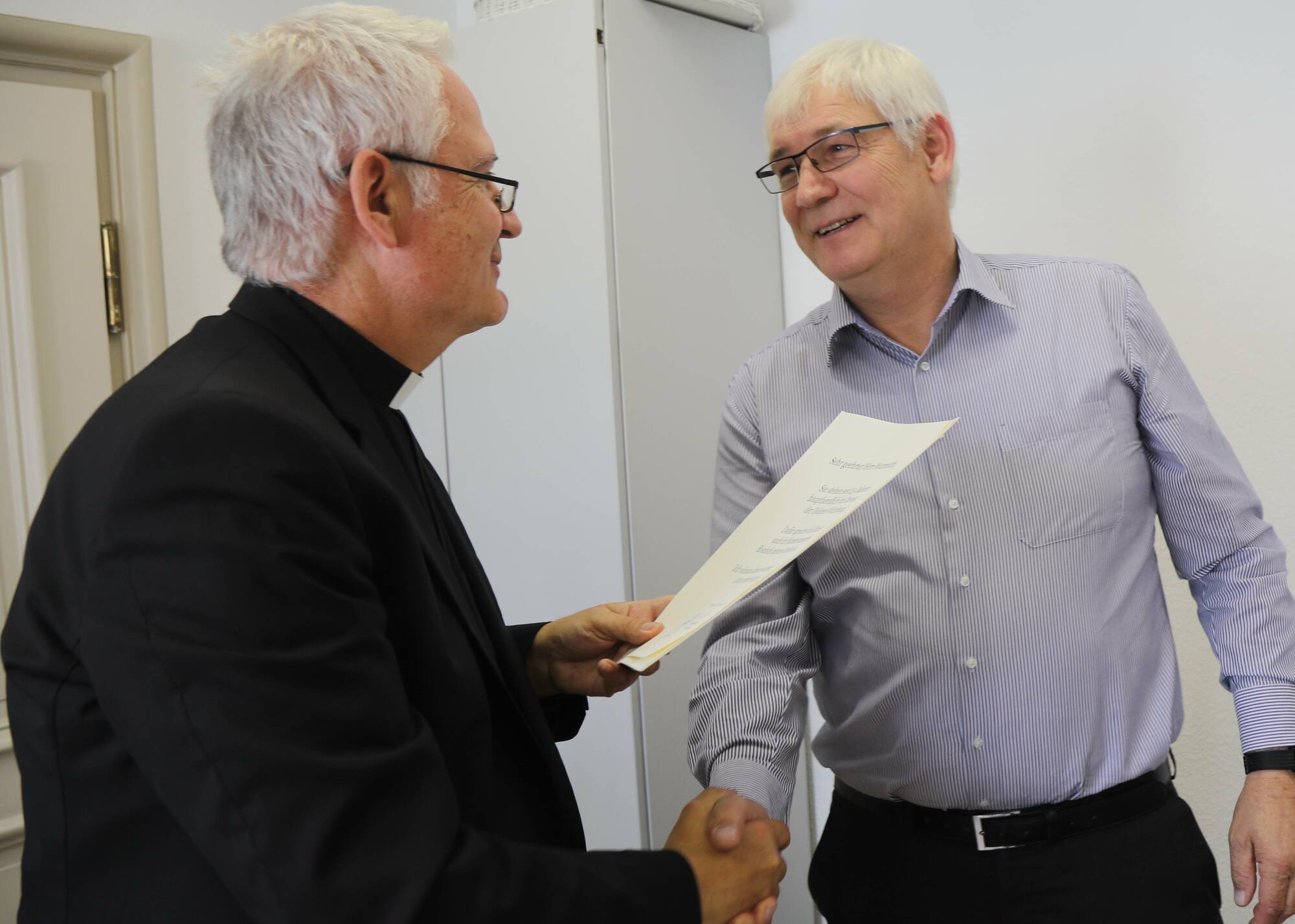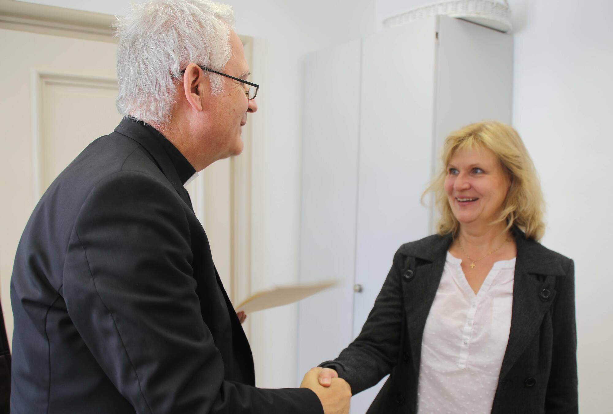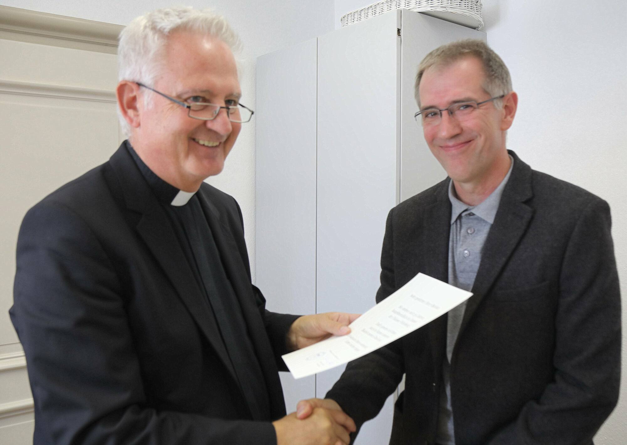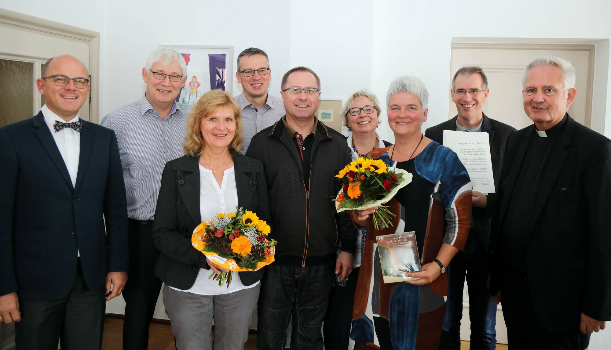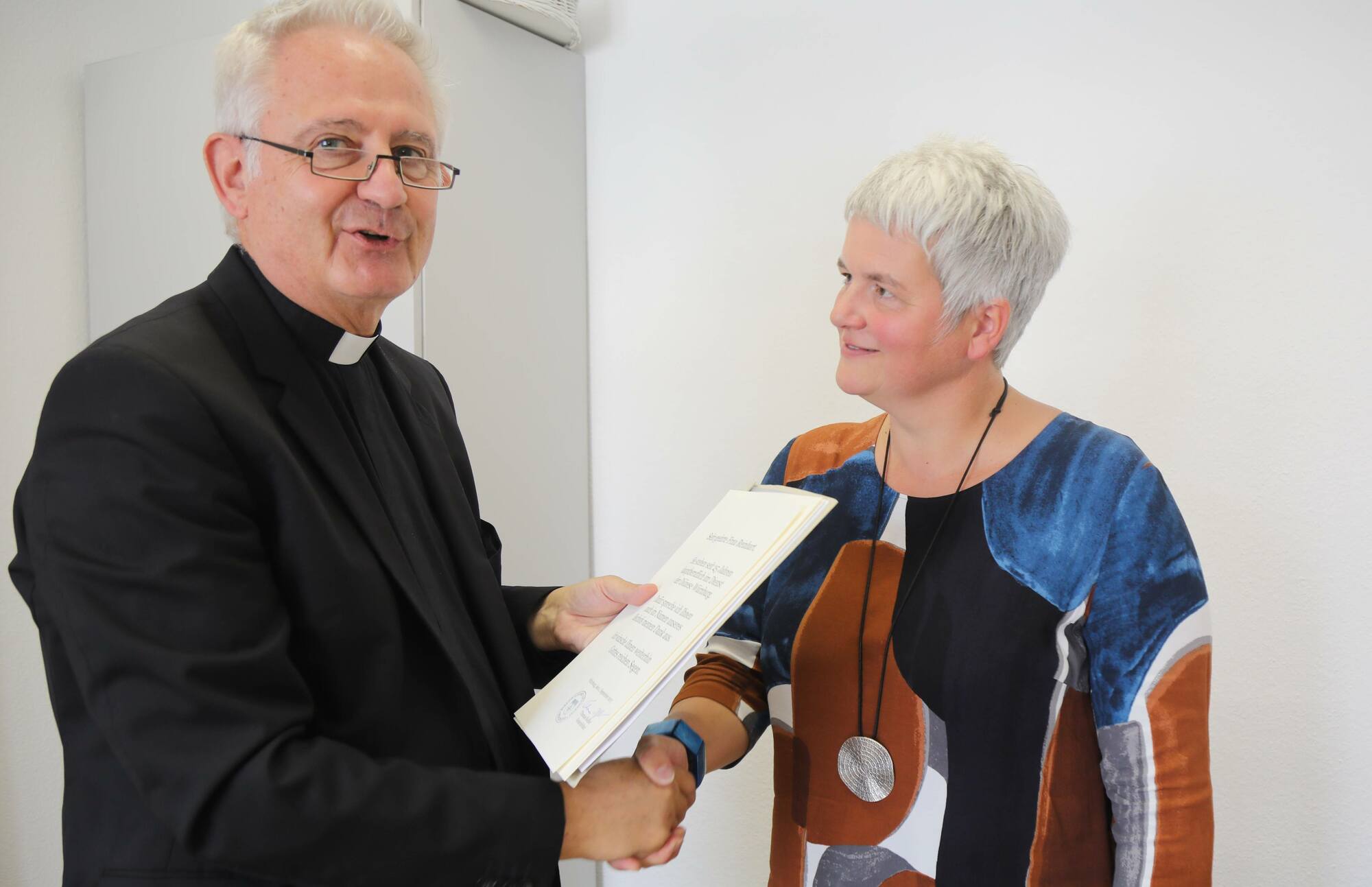 Domdekan Putz dankte den Frauen und Männern für ihren langjährigen und treuen Einsatz. An den Schulen leisteten sie einen wichtigen kirchlichen Dienst für die Menschen. „Die Verkündigung in der Schule ist eine bedeutende Teilhabe am Lehramt der Kirche.“ Die Qualität des Religionsunterrichts hänge entscheidend von der Person des Religionslehrers ab. „Denn wie beim Religionsstifter Jesus auch, ist bei seinen Zeugen Person und Sache nicht zu trennen“, betonte Putz. Über einen langen Zeitraum hätten die Geehrten gezeigt, dass sie in jeglicher Hinsicht mobil seien: Örtlich, organisatorisch und fachlich habe sich in den vergangenen Jahrzehnten für jede und jeden viel verändert. Im Namen der Mitarbeitervertretung (MAV) des Bischöflichen Ordinariats überbrachten Vorsitzende Dorothea Weitz und ihr Stellvertreter Wolfgang Keller mit nachdenklichen Texten von Axel Hacke Glück- und Segenswünsche.