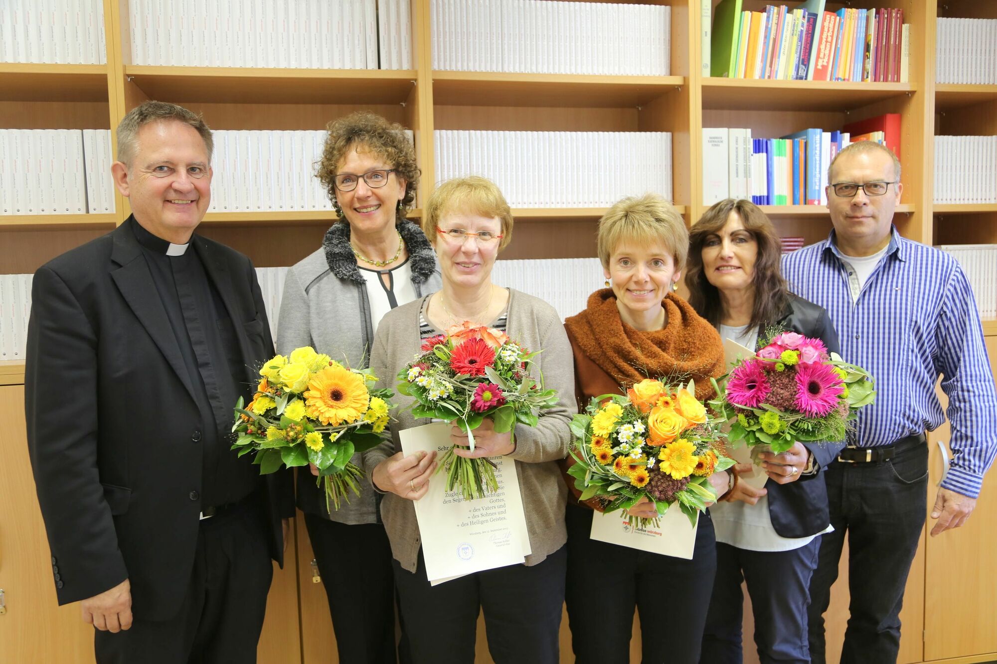 Domdekan Putz dankte den Frauen für ihren langjährigen und treuen Einsatz. Der Beruf des Religionslehrers sei nicht einfach nur ein Job, sondern mehr eine Berufung, betonte Putz und zog einen Vergleich zu den Aposteln. „Für Sie ist die Bekundung Ihres eigenen Glaubens so wichtig geworden, dass Sie ihn nicht nur allein für sich behalten wollen, sondern jungen Leuten dabei helfe den eigenen Sinnentwurf des Lebens zu finden.“ Rochus Schirmer dankte ihnen im Namen der Mitarbeitervertretung (MAV) für den „Dienst von Menschen für Menschen“. Als Religionslehrerinnen seien sie wichtige Wegbegleiterinnen, die den Schülern nicht nur die christliche Botschaft vermittelten, sondern zusätzlich Geborgenheit gäben und zeigten, wie man das Leben in die eigenen Hände nehme, betonte Schirmer.